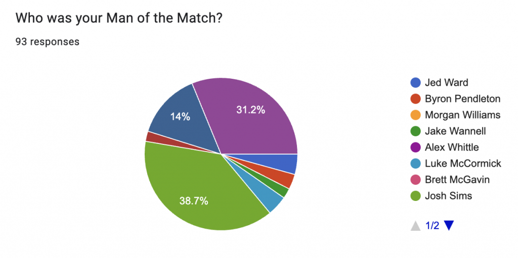 30.09.2025 | SUTTON UTD (Away) | 119 | JOSH SIMS (88 / 73.9%) | Andrew Oluwabori (20 / 16.8%) | Jed Ward (6 / 5%) |