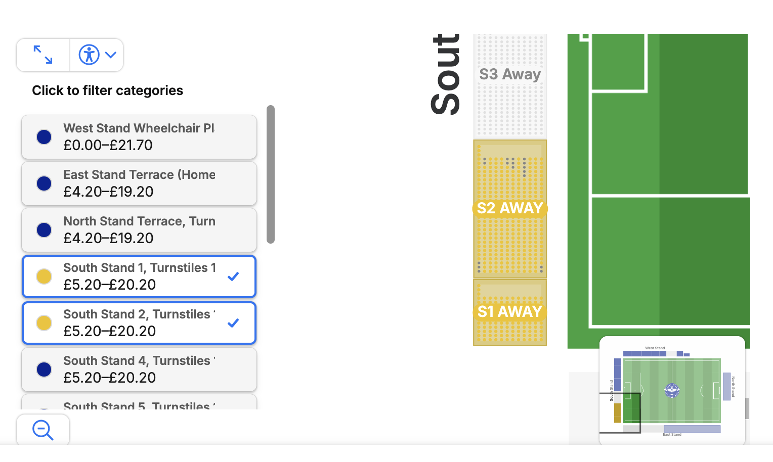 There are 11 step free seats at ground level solely for away fans which can be increased or decreased depending on the anticipated number of traveling supporters.