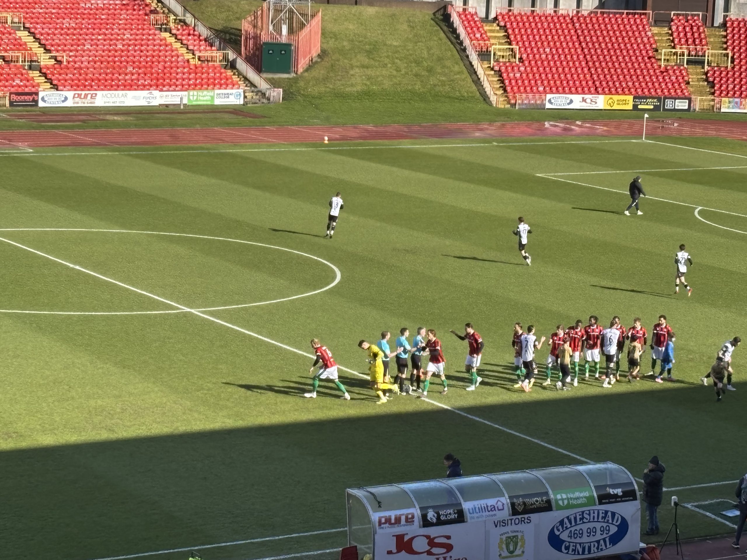 The big pre-match talking point was about the choice of Yeovil’s kit. Red and black striped away shirts, but the black shorts and socks were replaced by the white shorts and green socks worn at home. Presumably a kit clash with Gateshead’s black shorts and socks.