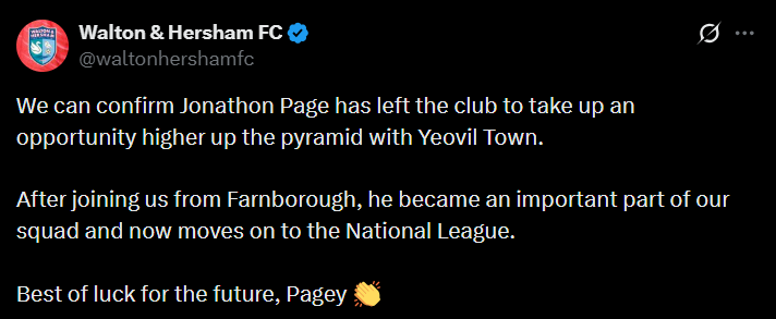 Earlier today the official account of Walton & Hersham posted on X: We can confirm Jonathon Page has left the club to take up an opportunity higher up the pyramid with Yeovil Town. After joining us from Farnborough, he became an important part of our squad and now moves on to the National League.